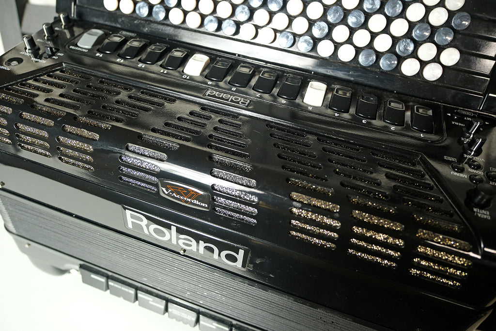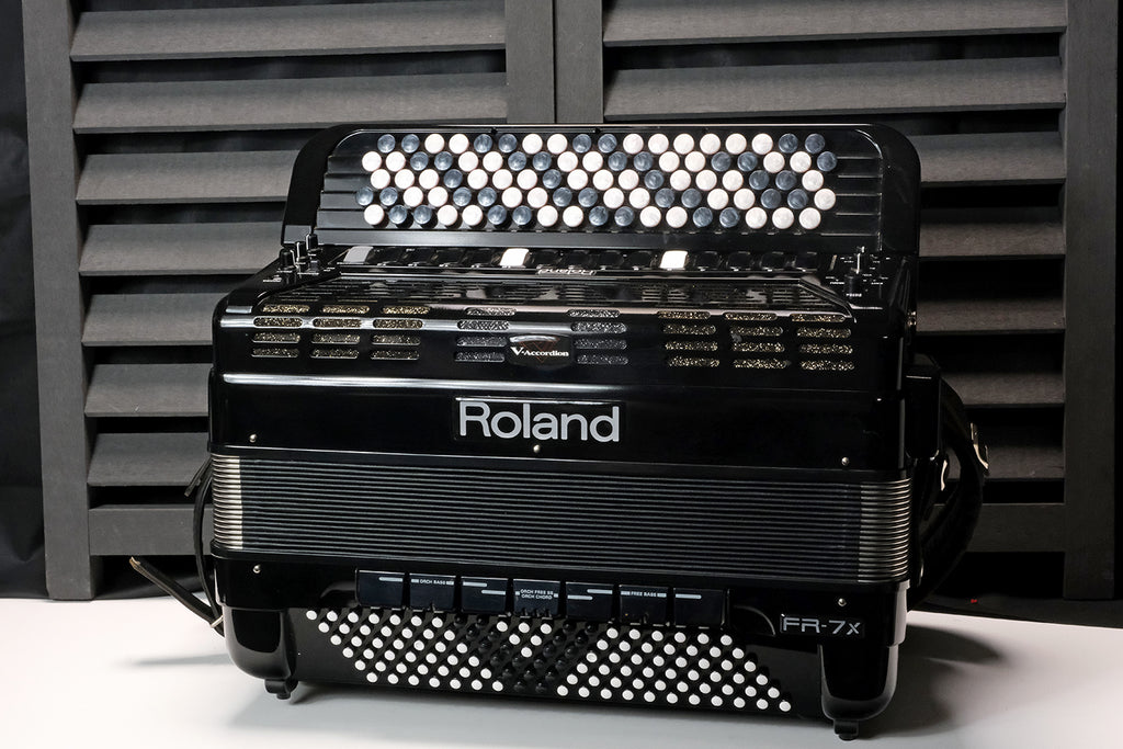 De Roland FR-7XB BK is een knop type V-Accordion met aan de rechter hand 92 knoppen en aan de linker hand 120 knoppen daarnaast bevat de accordeon speakers.