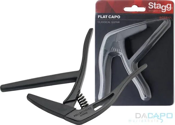 De Stagg SCPX-FL BK is een zwarte capo geschikt voor de klassieke gitaar. De capodaster is eenvoudig met één hand op de gitaar te zetten en er op dezelfde manier weer af te halen.