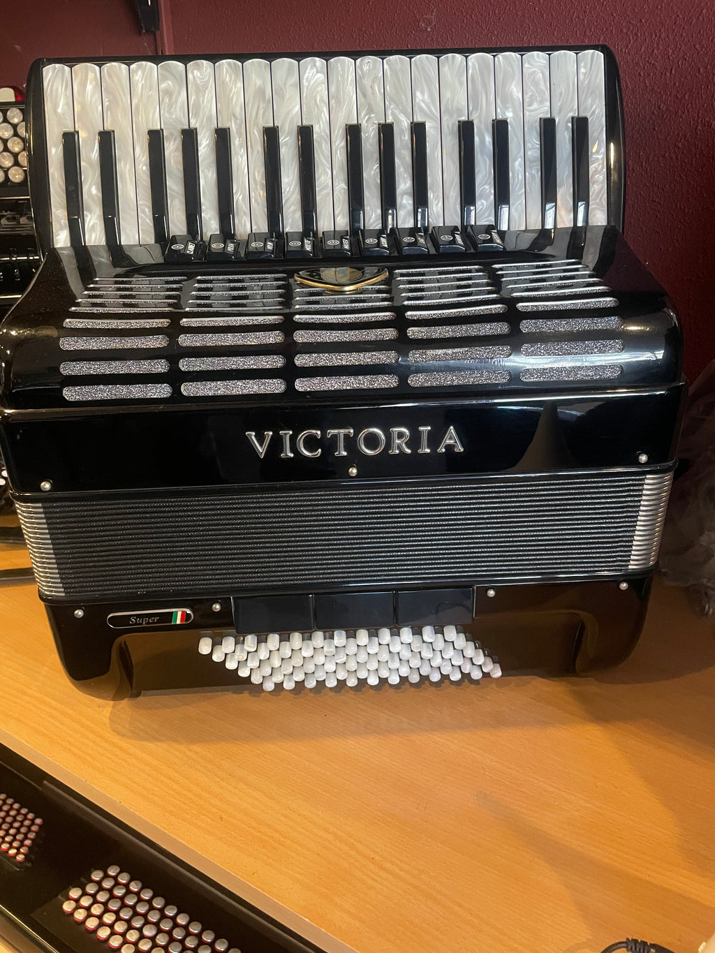 De Victoria Super is een uitvoering die zo compact is als een 72 basser. Deze kleine accordeon gedraagt zich als een grote. Zeer geschikt voor mensen die veel klankkleuren in een kleine accordeon zoeken.